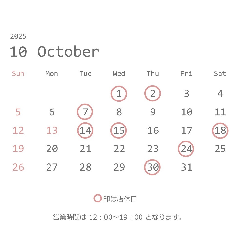 10月はイベントの開催と展示会出張のため、1日(水)、2日(木)、7日(火)、14日(火)、15日(水)、18日(土)、24日(金)、30日(木)が店休日となります。