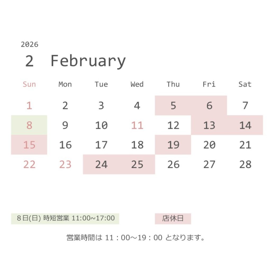 2月は、5日(木)、6日(金)、13日(金)、14日(土)、15日(日)、19日(木)、24日(火)、25日(水)が店休日となります。